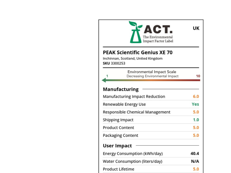PEAK’s gas generators are far more energy efficient as well – something which is highlighted on our Genius range of nitrogen generators with the introduction of the ACT EcoLabel which details the environmental impact of the equipment, from manufacturing to shipping to running.
